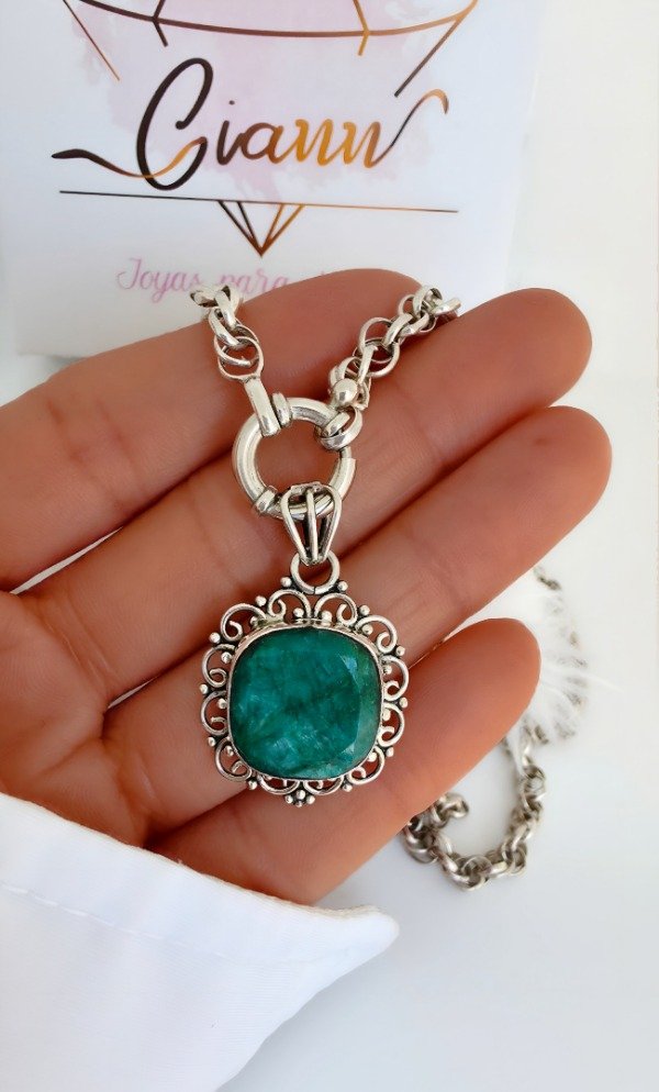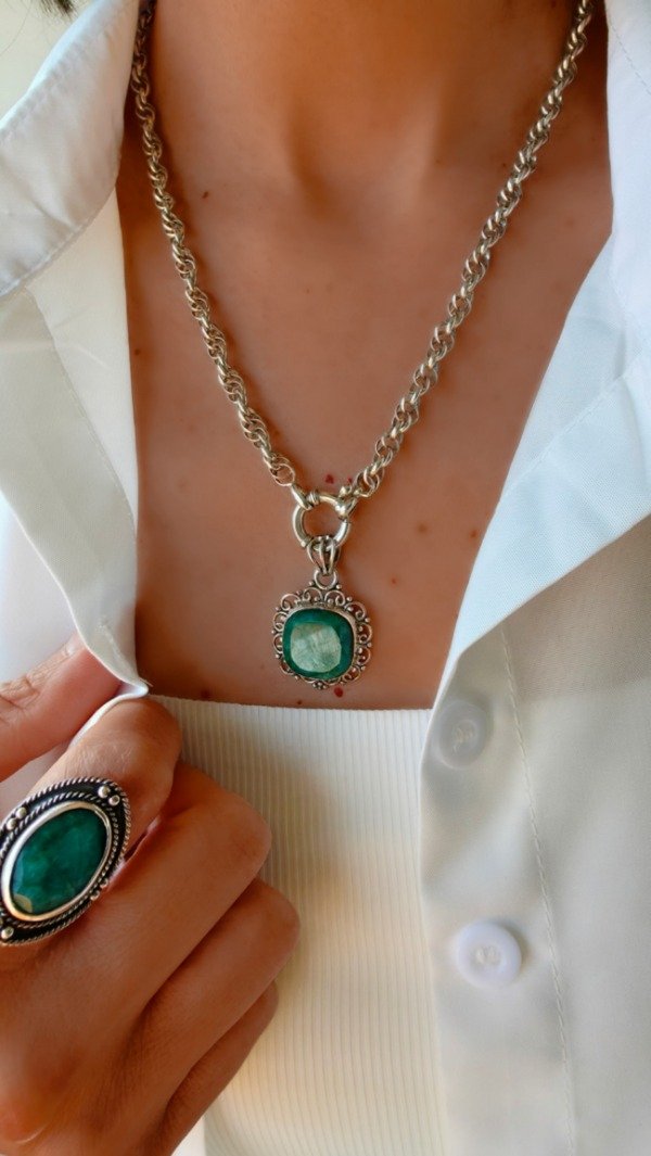 Cada piedra es única, con tonos verde-agua que transmiten serenidad y un brillo que resalta sobre la plata 925.